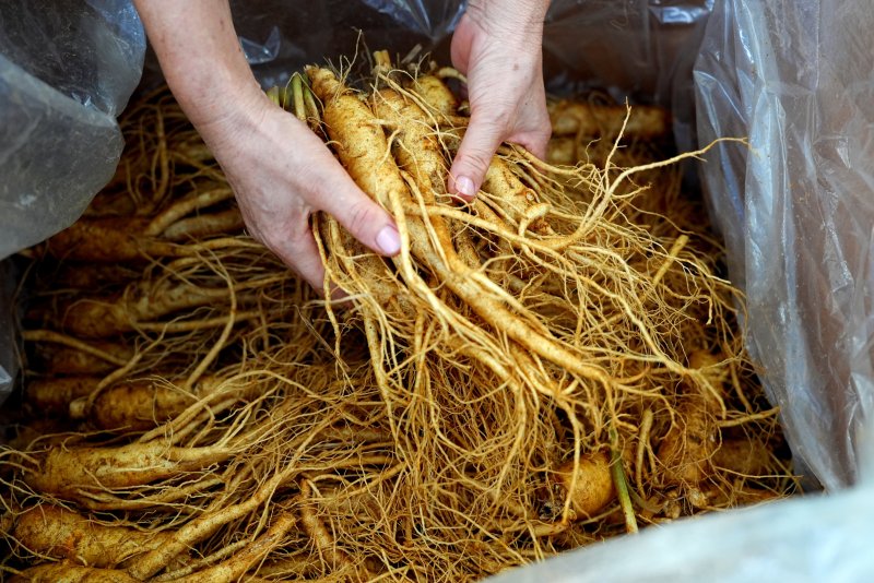 음성군 금왕읍의 농산물 판매 부스에서 판매자가 인삼을 들어 보이고 있다. 뉴시스
