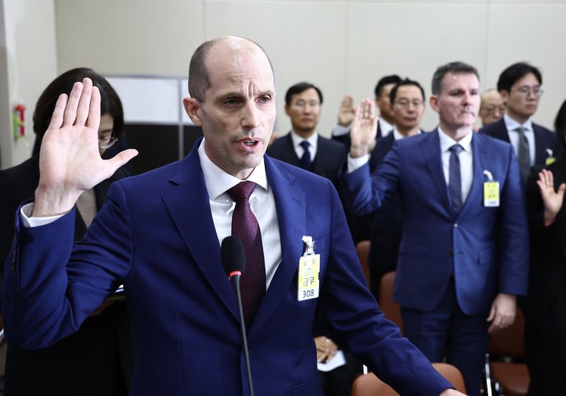 [서울=뉴시스] 김명년 기자 = 해롤드 로저스 쿠팡 대표이사가 30일 오전 서울 여의도 국회에서 열린 쿠팡 침해사고 및 개인정보 유출, 불공정 거래, 노동환경 실태 파악과 재발방지 대책 마련을 위한 연석 청문회에서 선서하고 있다. 2025.12.30. kmn@newsis.com [서울=뉴시스]이주혜 기자 = 쿠팡의 개인정보 유출 사태와 관련한 국회의 쿠팡 연석 청문회가 이틀째 계속된다.