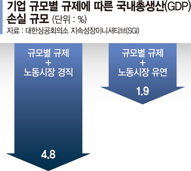 김천구 대한상의 SGI 연구위원은 "기업 규모별 차별 규제가 족쇄라면 경직된 노동시장은 그 충격을 증폭시키는 역할"이라며 "고용 후 유연한 조정이 어려운 구조가 경제 전반에 부담을 키우고 있다"고 말했다.