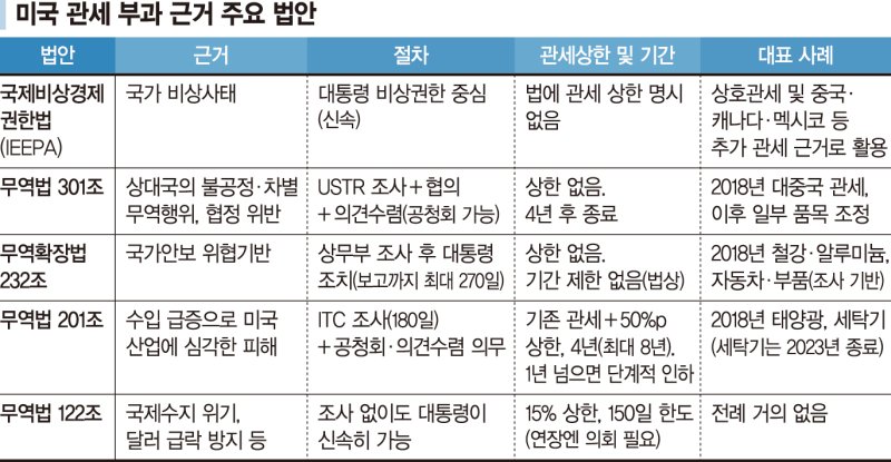 트럼프 행정부가 염두에 둔 대안은 △무역법 301조 △무역확장법 232조 △무역법 122조 △스무트-홀리 관세법 338조 등이다. 다만 이들 법안은 IEEPA처럼 대통령이 즉각 서명해 다음 날부터 관세를 부과할 수 있는 구조가 아니라는 점에서 한계가 분명하다는 지적이 나온다.