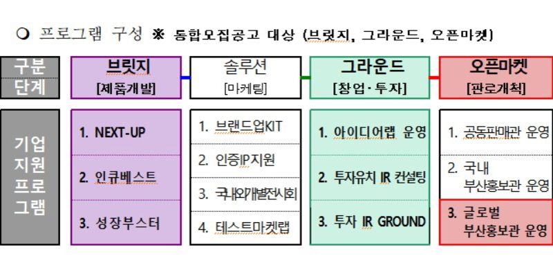 올해는 비즈니스 수요 단계에 따라 ‘비즈니스 그라운드(창업·투자 단계)’ ‘비즈니스 브릿지(제품개발 단계)’ ‘비즈니스 오픈마켓(판로 개척 단계) 등 단계별 맞춤형 지원이 이뤄진다.