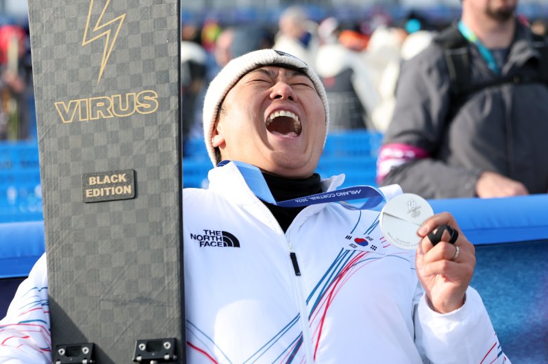 스노보드 남자 평행 대회전에서 값진 은메달을 획득한 김상겸이 8일(현지시간) 이탈리아 리비뇨의 스노파크에서 열린 2026 밀라노·코르티나담페초 동계올림픽 스노보드 남자 평행 대회전 시상식을 마친 뒤 기뻐하고 있다. 2026.2.8 ⓒ 뉴스1 김진환 기자 /사진=뉴스1