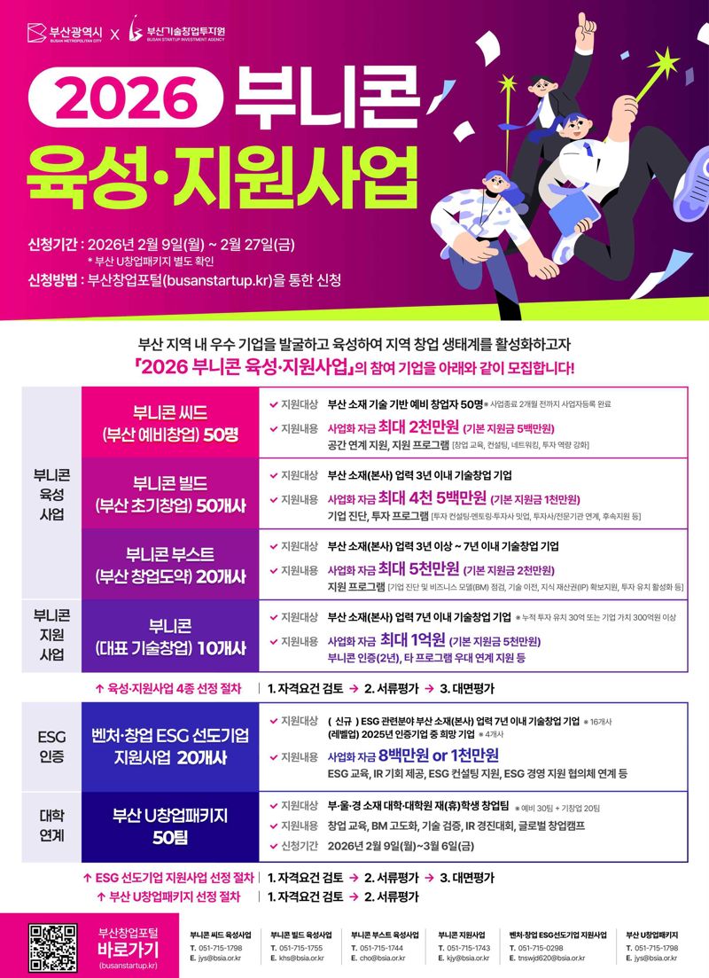 부산시와 부산기술창업투자원은 지역 우수 기술창업기업을 발굴, 육성하기 위해 ‘2026 부니콘 육성지원사업’을 마련, 9일부터 오는 27일까지 참여기업을 모집한다고 밝혔다.