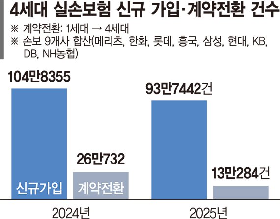9일 업계에 따르면 손해보험 9개사(메리츠·한화·롯데·흥국·삼성·현대·KB·DB·NH농협)의 1세대 실손보험에서 4세대 상품으로의 전환 건수는 2024년 26만732건에서 2025년 13만284건으로 약 50% 줄었다.