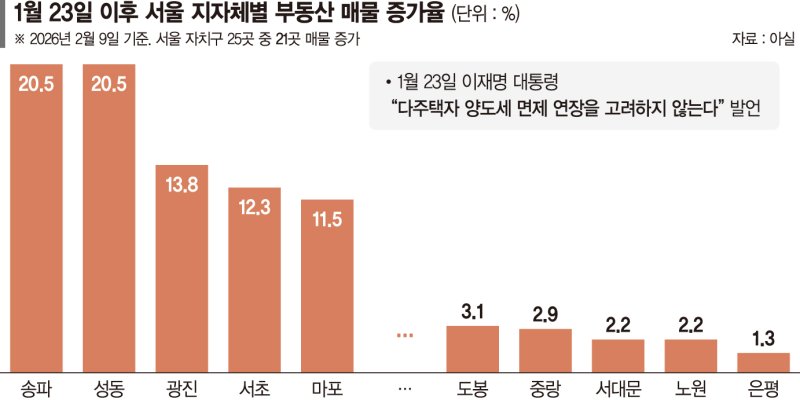 특히 이재명 대통령이 다주택자 양도세 중과 유예 종료를 선언한 1월 23일을 기점으로 매물을 비교하면 매물이 줄어든 자치구는 4곳 뿐이다. 매물이 늘어난 21곳 중 △송파 20.5% △성동 20.5% △광진 13.8% △서초 12.3% △마포 11.5% 등 한강벨트의 증가세가 크지만, 외곽 지역도 최근 상승 전환했다. 도봉구는 3.1%, 중랑구는 2.9%, 서대문구와 노원구는 2.2%, 은평구는 1.3% 늘었다.