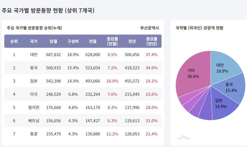 국적별로는 대만 관광객이 총 68만 7832명(18.9%)을 기록하며 가장 많이 방문한 나라로 이름을 올렸다. 이어 중국(56만 915명, 15.4%), 일본(54만 2398명, 14.9%), 미국(24만 8529명, 6.8%), 필리핀(17만 6668명, 4.8%), 베트남(15만 6656명, 4.3%) 등의 순으로 부산을 많이 찾았다.