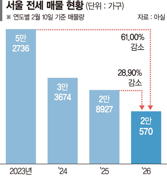 자치구별로는 도봉구가 333건에서 221건으로 33.4%(111건) 줄며 가장 많이 감소했다. 이어 △구로구 32.0%(122건) △노원구 28.6%(196건) △금천구 25.8%(46건) △관악구 24.2%(61건) △강북구 24.1%(32건) 등이 서울 평균을 크게 웃돌았다. 특히 2023년과 비교하면 노도강·금관구 전세 매물 감소 폭이 80%를 넘는 것으로 나타나는 등 구조적인 공급 축소도 이어지는 모습이다.