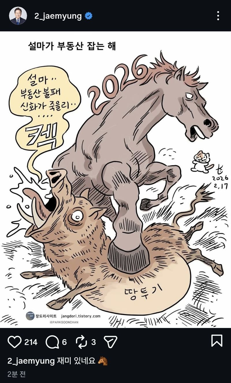 만화와 함께 공개된 글에서 박순찬 기자는 "2026년 병오년(丙午年)은 '붉은 말의 해'"라며 "부동산 투기와의 전쟁을 선포한 이재명 정부는 시민들의 개혁 열망을 믿고 달려나가길 기대한다”고 밝혔다.