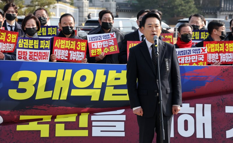 송언석 원내대표도 이 자리에서 "사법파괴 3대 악법에 대해 거부권을 행사하지 않는다면 이 대통령 스스로 대한민국 5000년 역사의 큰 죄인이 되고 말 것"이라며 "오늘 이곳 청와대에서 3대 악법이 그대로 공포한다면 공소취소 선동, 대법원장 사퇴 공갈협박 같은 집권세력의 대한민국 헌법 파괴 선동 판도라의 상자를 여는 것이 될 것"이라고 강조했다.