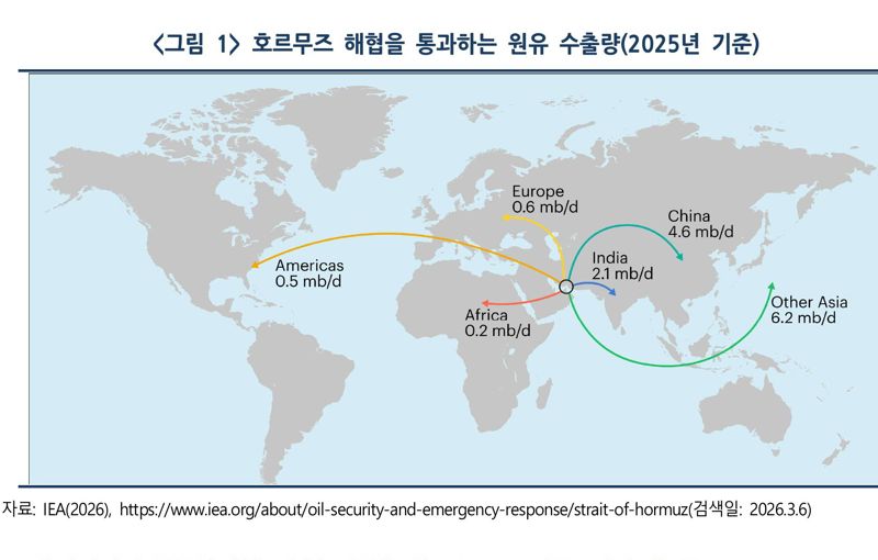 호르무즈 해협은 세계 해상원유 총 교역량의 약 34%, 천연가스(LNG)의 20% 가량이 통과하는 국제 ‘에너지 초크포인트(Choke point)’다. 특히 한국과 일본, 중국을 비롯한 동북아시아 국가들은 에너지 수입 부문에서 중동의 비중이 커 호르무즈 해협에 대한 의존도가 매우 높은 현실이다. 한국은 원유 수입의 약 70%를 중동에서 조달하고 있는 것으로 집계된다.