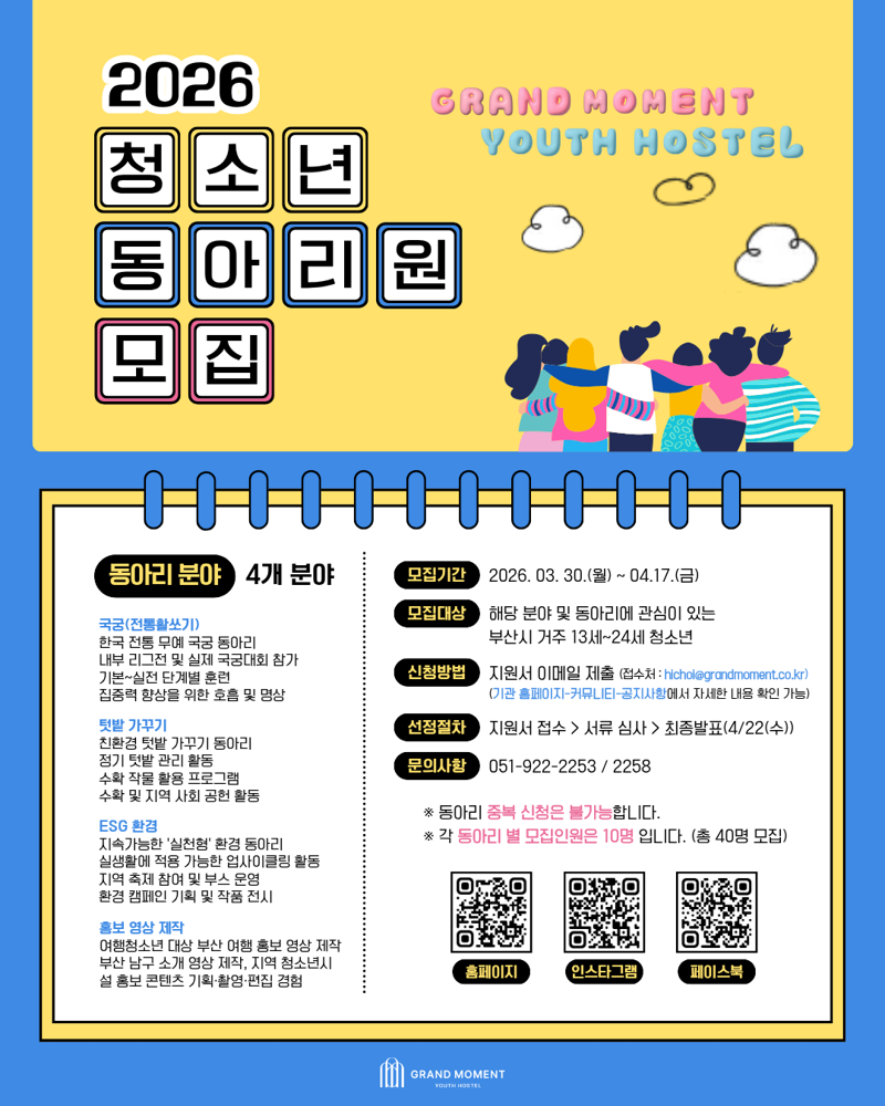 [파이낸셜뉴스] 부산 남구에 위치한 그랜드모먼트 유스호스텔(운영대표 박수영)은 오는 17일까지 청소년들의 자율적 참여와 역량 강화를 위해 신규 청소년동아리 회원을 모집(사진)한다고 1일 밝혔다.