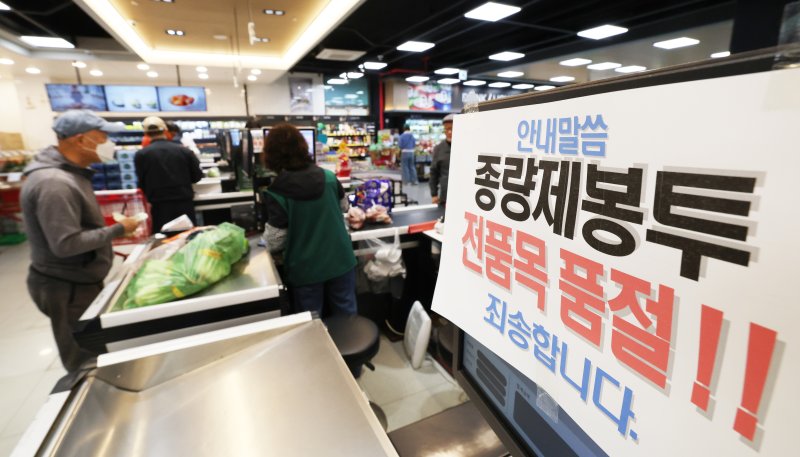 중동 사태 장기화로 비닐을 만드는 원료인 나프타 수급 불안이 확산되며 생필품 품귀 현상을 우려한 사재기 현상이 나타나고 있는 가운데 31일 경기 화성시의 한 마트에 종량제 봉투 품절 안내문이 붙어있다. 뉴스1