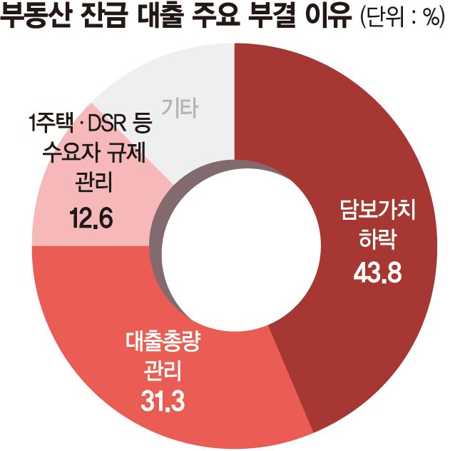 부결 원인에 대해 현장에서는 갈수록 강화되는 대출 규제와 담보가치 하락 등을 주요 원인으로 꼽고 있다. 1주택자 처분 조건부 대출과 대출 총량관리 등 규제에다 담보가치 하락 등이 불승인 주요 원인이라고 했다.
