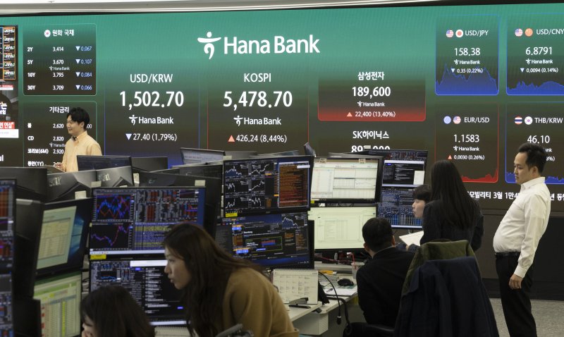 [서울=뉴시스] 김근수 기자 = 코스피는 전 거래일(5052.46)보다 426.24포인트(8.44%) 오른 5478.70에 마감한 1일 서울 중구 하나은행 본점 모니터에 지수가 나오고 있다.코스닥 지수는 전 거래일(1052.39)보다 63.79포인트(6.06%) 상승한 1116.18에 거래를 마쳤다. 외환시장에서 원·달러 환율은 전 거래일(1530.1원)보다 28.8원 내린 1501.3원에 주간 거래를 마감했다. 2026.04.01. ks@newsis.com [서울=뉴시스] 이정필 기자 = 지난달 5대 시중은행의 정기예금과 정기적금이 10조원 가까이 빠져나갔다. 1년 만기 예금금리가 2%대 수준에 머물면서 증시 투자 등으로의 자금 이동 수요가 반영된 것으로 풀이된다.