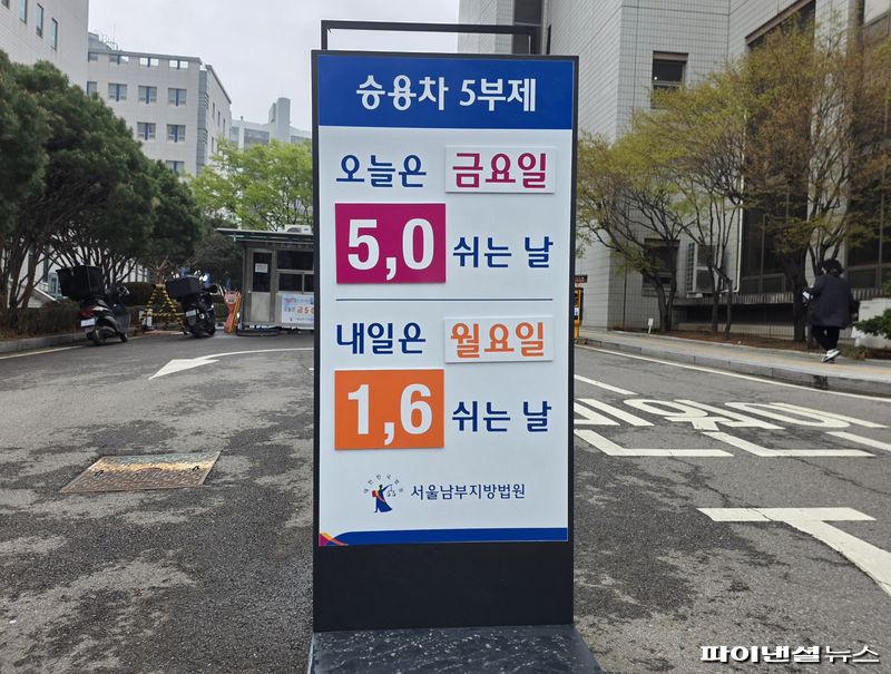 서울남부지방법원 입구에도 '오늘은 금요일. 5, 0 쉬는 날'이라고 적힌 대형 안내판이 놓여 있었다. 한 운전자가 "1시간 걸려 왔다. 서류 하나만 내면 된다"고 호소했지만, 굳게 닫힌 차단기 앞에서 결국 유턴했다. 한때 후진하던 차량과 진입 차량이 뒤엉키며 서로 경적을 울리는 모습도 포착됐다.