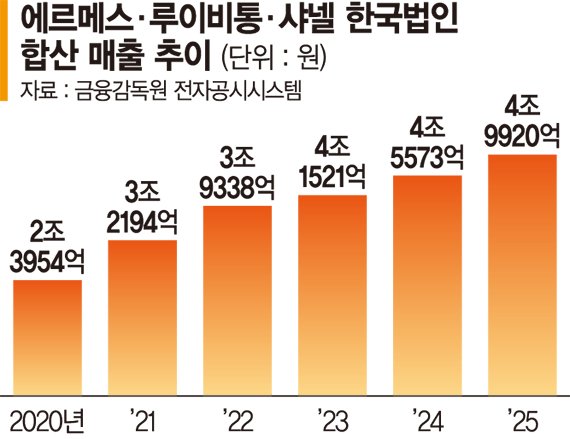 15일 금융감독원 전자공시시스템에 따르면 에르메스, 루이비통, 샤넬 한국법인의 지난해 합산 매출액은 4조9920억원으로 전년(4조5573억원) 대비 9.5% 증가한 것으로 집계됐다.