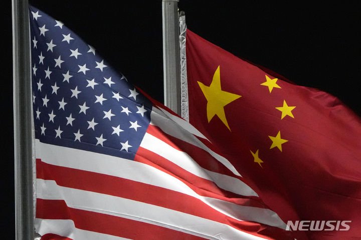 2022년 2월 2일 동계올림픽이 열리고 있는 중국 장자커우(張家口)의 겐팅 스노우 파크에 미국과 중국 국기가 게양돼 있는 모습. 사진=뉴시스