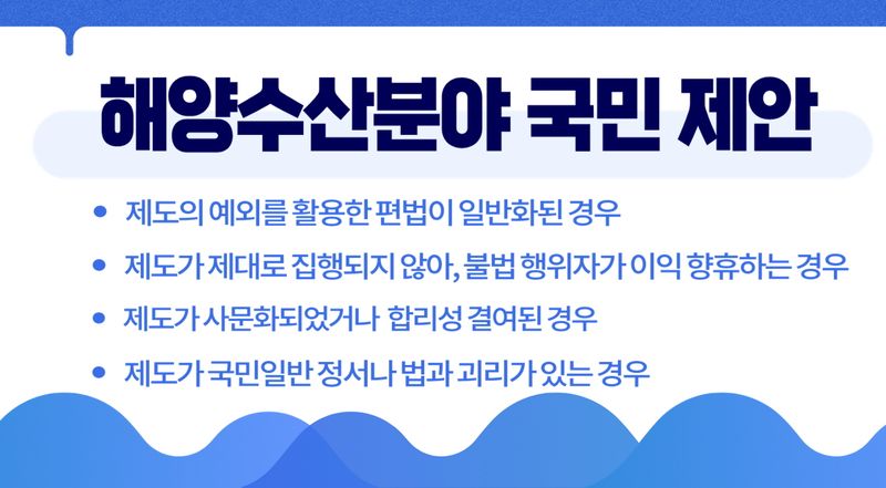 해수부는 이를 통해 제도의 예외를 활용한 편법이 일반화된 사례를 발굴하거나 제도를 제대로 집행하지 않아 불법 행위자가 이익을 얻는 사례 등을 찾아 개선할 예정이다. 또 제도가 사문화됐거나 합리성이 결여된 사례도 찾아 개선에 나선다.