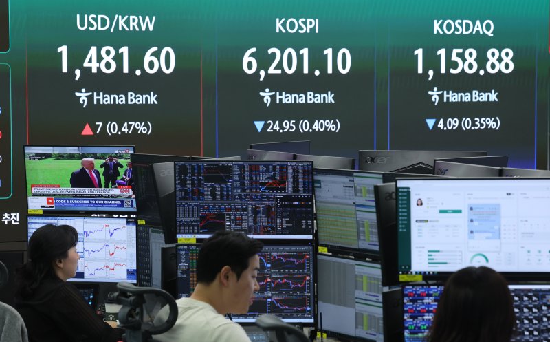 17일 오전 서울 중구 하나은행 딜링룸 현황판에 코스피 지수가 나타나고 있다. 2026.4.17 ⓒ 뉴스1 박지혜 기자 (서울=뉴스1) 박승희 기자 = 미·이란 협상 기대와 실적 시즌이 맞물리며 코스피가 '육천피'(6000포인트)를 회복했다. 중동 리스크 완화 기대 속에 실적 개선에 따른 이익 전망 상향이 이어지면서 증시가 전고점 돌파를 시도할 수 있을지 주목된다.