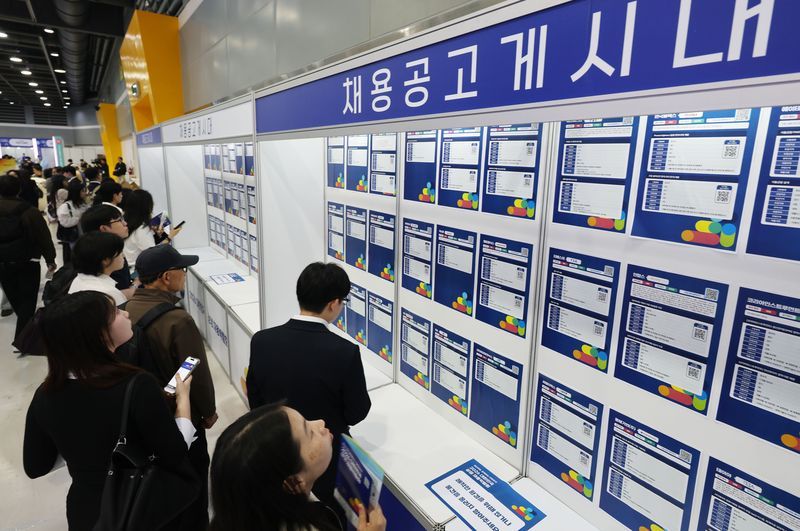 서울 서초구 aT센터에서 열린 2026 대한민국 상생 채용박람회에서 구직자들이 채용공고 게시대를 살피고 있다. /사진=연합뉴스