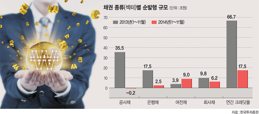 기업들 자금조달 꺼렸지만 기준금리 두차례 인하에 금리 높은 BBB급 수요 ↑ 전체 크레딧물 12兆로 ↓ 시장 '물건 구하기' 어려워 올 외국인 영향력은 여전 '웅진사태' 이후 양극화된 회사채시장은 올 한해 기업 및 등급 간 차별화 양상을 보였다. 기업들은 글로..