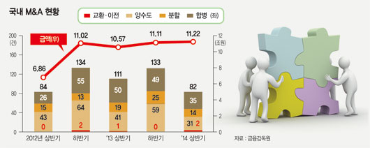 산업계 '웃고' 비주력社 팔아 재무구조 개선 금융계 '울고' 묶어 팔려다 흥행실패올해 상반기 11조2000억원 2012년 이후 반기 최고치 올초 KT·포스코 신호탄 삼성·한화 빅딜까지 후끈 우리금융지주 민영화 매각 패키지딜 방식에 저평가 中·日자본도 M&A '군침' ..