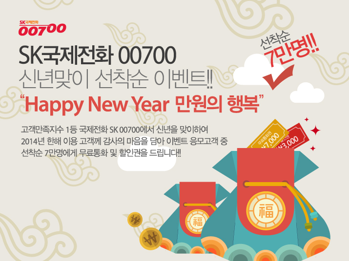 SK텔링크 국제전화 '00700'이 고객 성원에 보답하고 새로운 마음가짐으로 '2015 을미년(乙未年)' 청양의 해를 맞이하는 의미로 '해피 뉴 이어 만원의 행복!' 고객감사 이벤트를 실시한다고 15일 밝혔다. 이번 신년맞이 고객감사 이벤트는 2014년 한 해 동안 1회 이상 00700을 이용한 모든 고객들을 대상으로 하며 선착순 7만명에게 국제전화 00700 7000원 무료통화권과 오픈마..