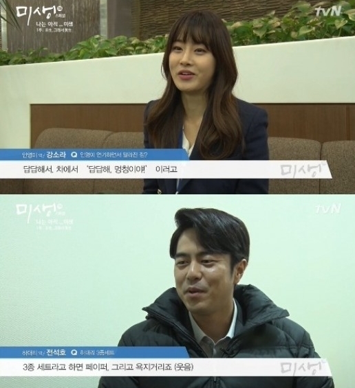 ▲ 전석호 강소라 미생 미생 김원석PD가 강소라와 전석호가 원래 러브라인이었다고 말했다. 지난 12월 26일 방송한 tvN 금토드라마 '미생'(극본 정윤정, 연출 김원석) 스페셜 '나는 아직…미생' 1회에서는 안영이 역의 강소라와 하대리 역의 전석호 관계가 분석됐다. 이날 강소라는 “안영이 역을 하며 실제 내 성격이 격해졌다. 차 안에서 너무 답답해 ‘답답해 이 멍충아’라..